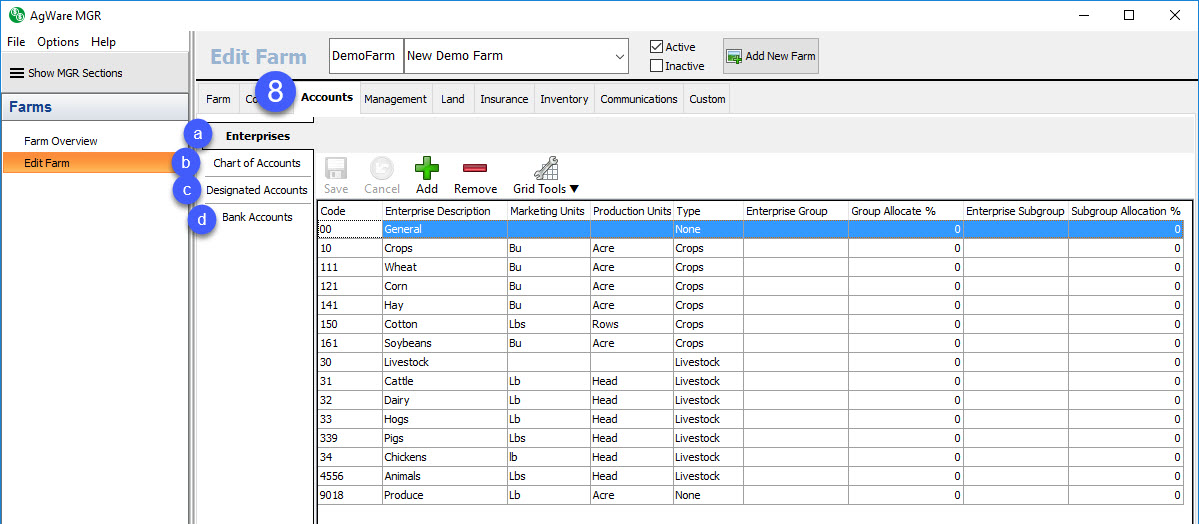 a. Add appropriate enterprises to the farm on the enterprise subtab. Be sure to enter your general enterprise accounts.