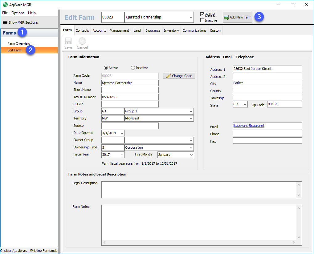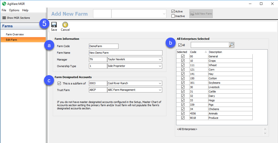 a. Enter the farm code, farm name, manager, and ownership type in the farm information group.