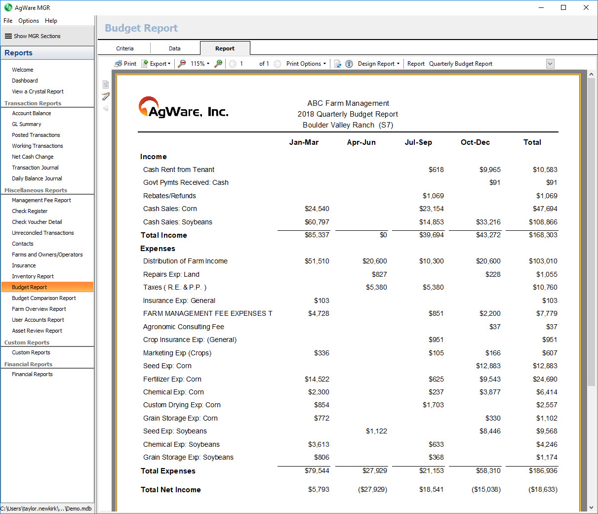The GL accounts on each report are grouped by their normal balance into an income group for credit normal accounts, and an expense group for debit normal accounts. The difference of the total budgeted income and total budgeted expenses is then shown as a total budgeted net income for the farm. All budget numbers on the system reports are rounded to whole dollars.