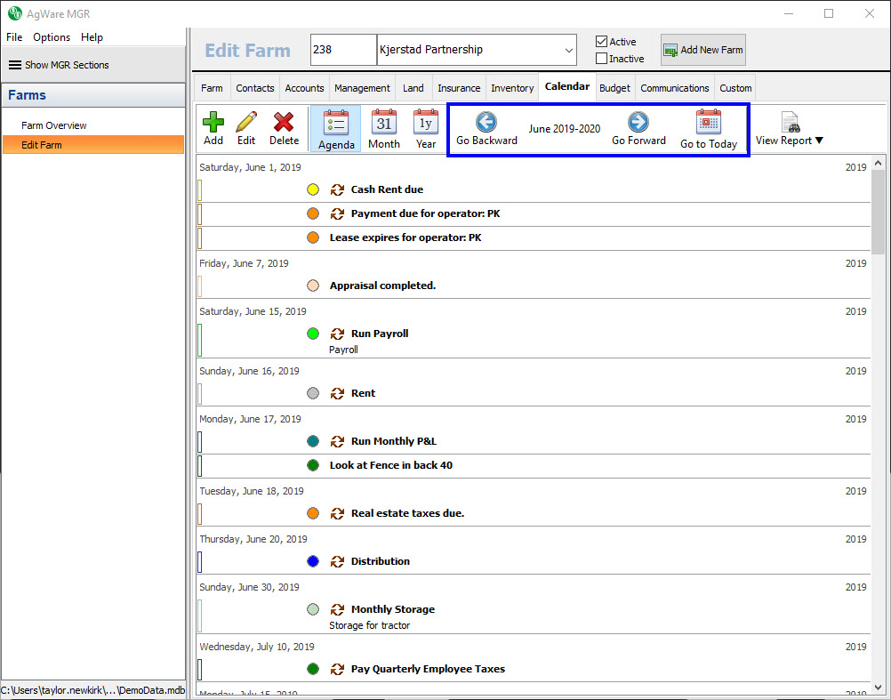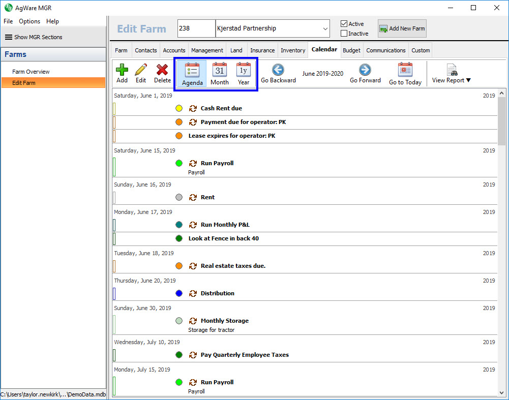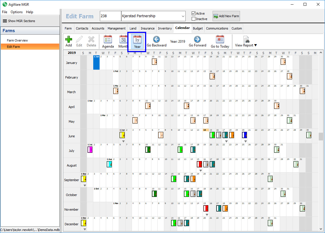The calendar tab of the Farms, Edit Farm section contains all of the reminder events for the farm displayed in a calendar format. For a general overview of Farm Reminders, please read the Farm Reminders knowledge base article.