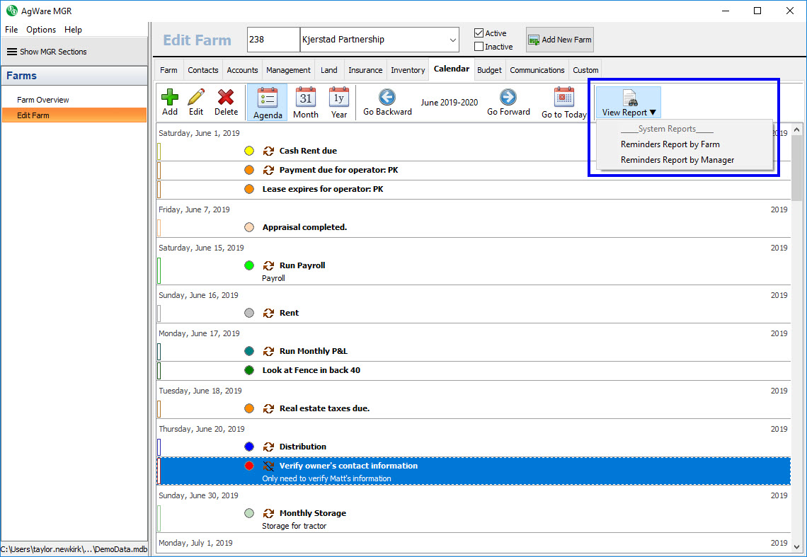 The view report button on the toolbar allows the reminder reports to be run for the current farm and date range that is displayed on the toolbar. Any custom reports will also be available in the list.