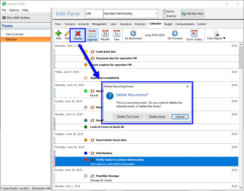Any memo or transaction reminder can be deleted using the delete button on the toolbar. When deleting a single event, a delete confirmation dialog will appear prompting to “delete” or “don’t delete”. If the event is a recurring event, a pop up similar to the edit popup will appear asking if the user wants to delete the single occurrence in the recurring event, or delete the whole series. There is not an extra delete confirmation after choosing whether to delete the event or series. Deleted events cannot be recovered.