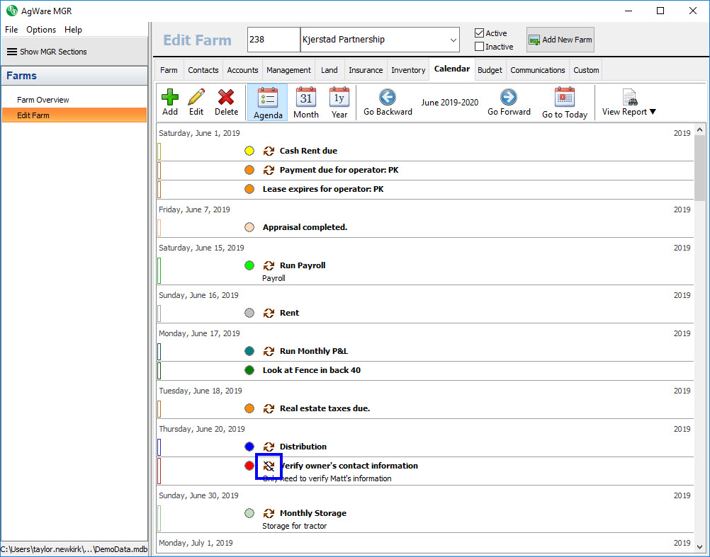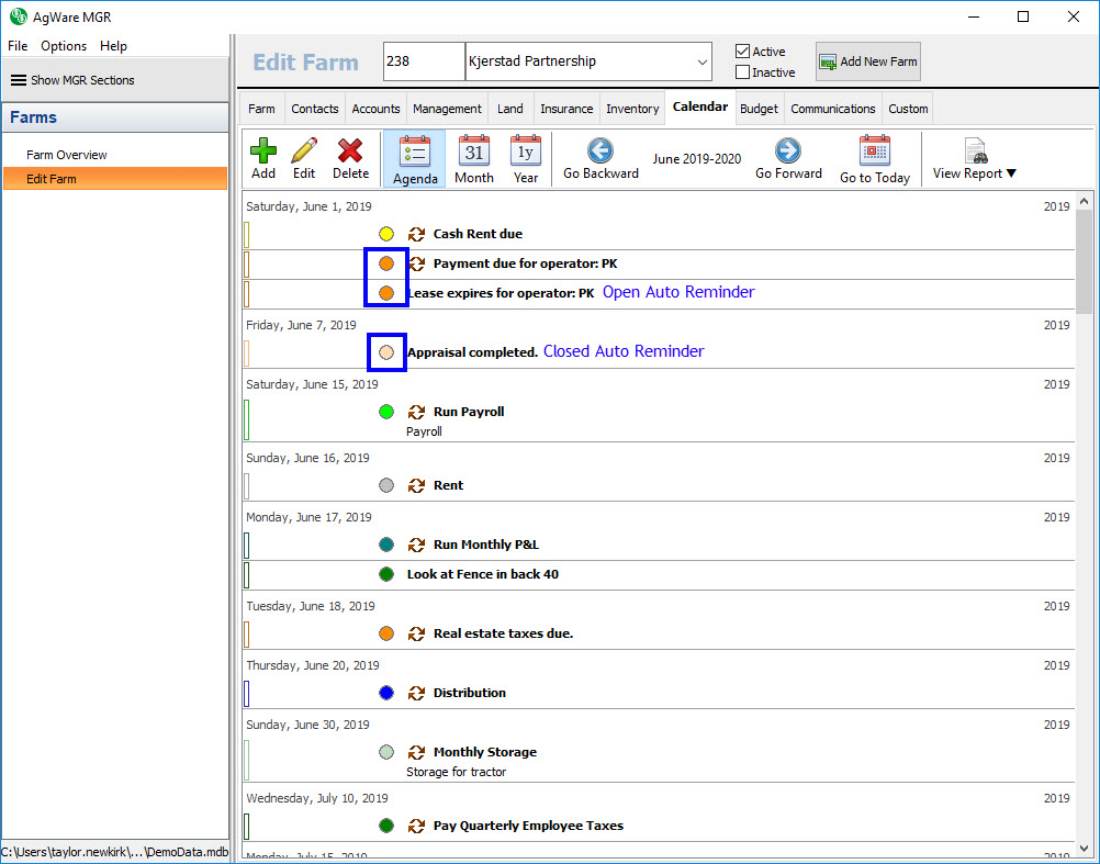 When looking at the agenda view, there will be a full year’s worth of reminders shown. The date range is determined by finding the next open reminder from today’s date and showing twelve months after that. Any open auto reminders will have a default label color of bright orange, and any closed (or completed) auto reminders will have a default label color of light orange.