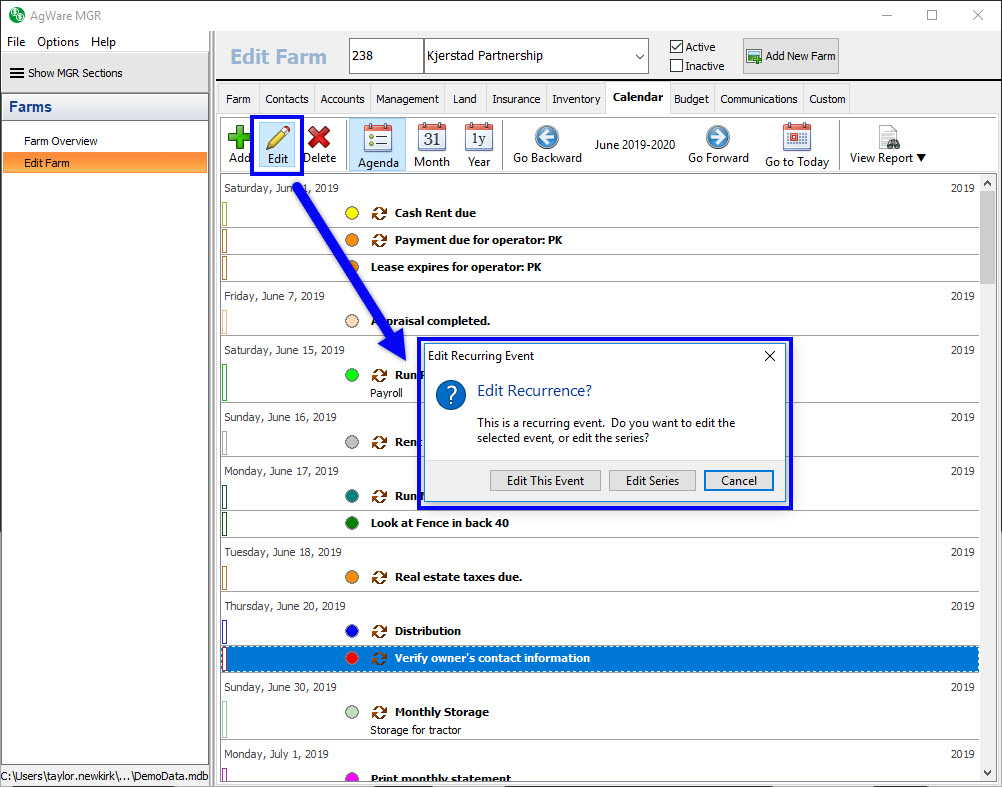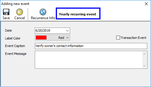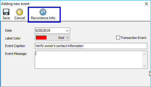 Any open memo or transaction reminder can be edited using the edit button on the toolbar. If the event is a single event, the event dialog form will pop up allowing changes to be made to the event. If the event is a recurrence, an edit recurrence dialog will pop up asking if the user wants to edit this single occurrence of the recurring event, or edit the whole series. If edit this event is chosen, once the changes are saved there will now be a line through the recurring icon on the event. This is to indicate that this one event in the occurrence has been modified.