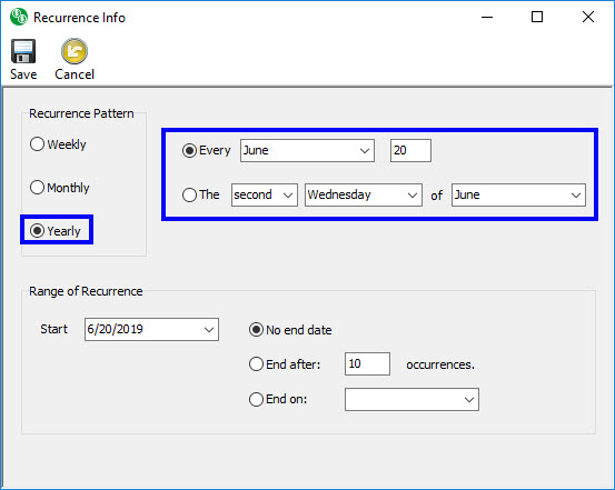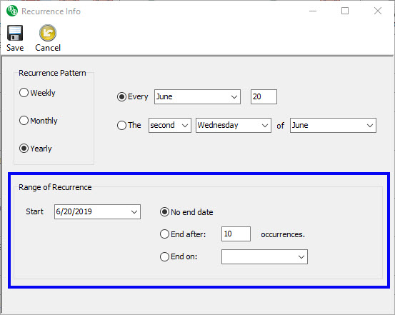 Once the recurrence pattern is set, the range of recurrence needs to be specified. The start date will default to the start date entered on the event dialog form. Next, choose an end date option. By default, no end date will be selected. The event can also either end after a certain number of occurrences, or on a specific end date.