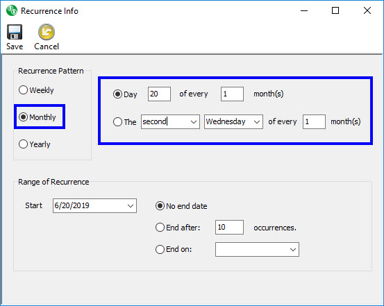 The calendar also supports recurring events for all reminder types. To create a recurring event, use the same add button on the toolbar to create a new event. Enter the required fields for either the memo reminder or transaction reminder. Then, click the recurrence info tool bar button. This will pop up the recurrence info dialog form. The first item to choose is the recurrence pattern. The recurrence pattern defines how often and when the occurrences happen.