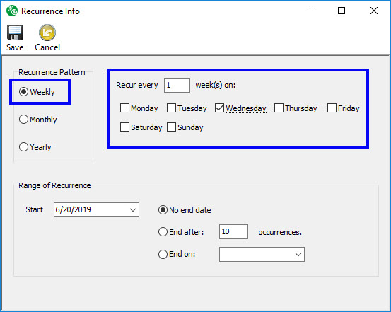 If the event is a weekly recurring event, then enter the frequency in the number field. Next, you’ll check the desired days it recurs on. For example, I might set up a recurrence that happens every week on Wednesday so I’ll put a one in the number field and check the box next to Wednesday.