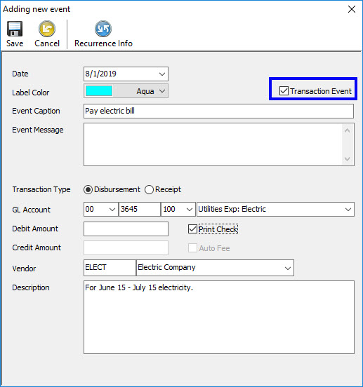 The last type of reminder for a farm is a transaction reminder. To add a single transaction reminder, click the same add button on the toolbar and follow the same steps outlined above for the memo reminder by entering a date, selecting a label color, and typing in an event caption. To indicate that this event is a transaction event, check the transaction event box. Once it is checked, the transaction fields will appear in the event dialog form. First, select the transaction type of disbursement or receipt. If disbursement is chosen then only the debit amount field will be enabled, as well as the print check box. If receipt is chosen then only the credit amount field will be enabled, as well as the auto fee check box. Next, enter the GL account code or use the drop down option to select it from the list. AgWare understands that sometimes an exact amount may not be known when creating a reminder, so the amount fields and their corresponding check box are option fields. Then, enter or select the vendor for the transaction. Last, enter the transaction description if desired. The amount and description fields can be changed when walking through the Process Reminders wizard. Once all required fields have been completed, click the save button and the event will be shown on the calendar view.