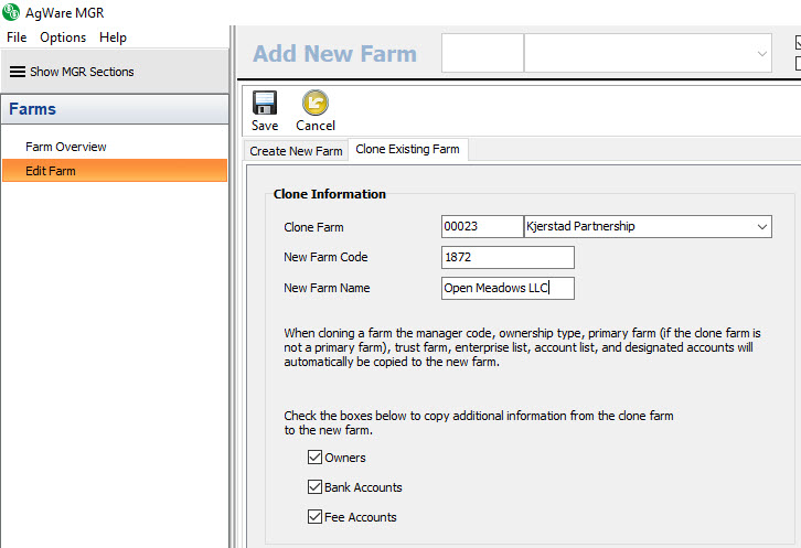 First, start by choosing the farm you would like to clone in the clone farm drop down selector. Next, enter the desired new farm code. It needs to be a unique code fifteen characters or less in length. Then, enter the desired new farm name. When cloning a farm, these are the only required fields; the program will automatically copy the manager code, ownership type, primary farm (if the clone farm is not a primary farm), trust farm, enterprise list, account list, and designated accounts.
