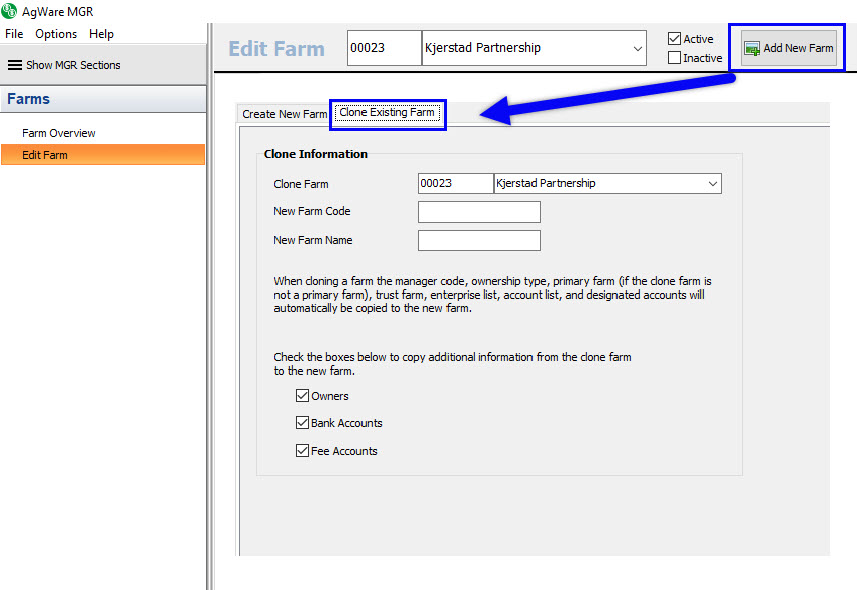 AgWare also offers the ability to copy the owners, bank accounts, and fee accounts. These options are checked by default.