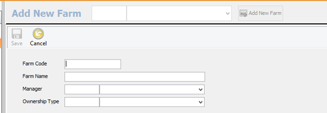A New Farm window will appear. Fill out the Farm Code, Name, Manager, and Ownership type and hit save. You will then need to go through all the Edit Farm tabs to set the new farm up. Be sure to be thorough on this initial set up, especially in the Accounts tab.
