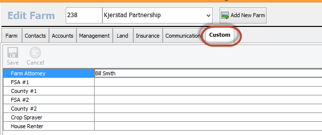 The final tab in Edit Farms is the Custom Tab. This will show the custom fields that you have developed in the Setup Section of the program.