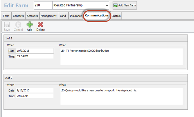 The 7th tab in Edit Farm is the Communications tab. This is where you can come and add conversation notes with owners or operators.