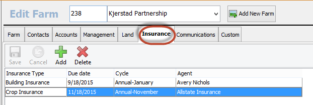 The next tab in Edit Farm is the Insurance tab. Insurance due dates, cycles and agents can be added in this section.