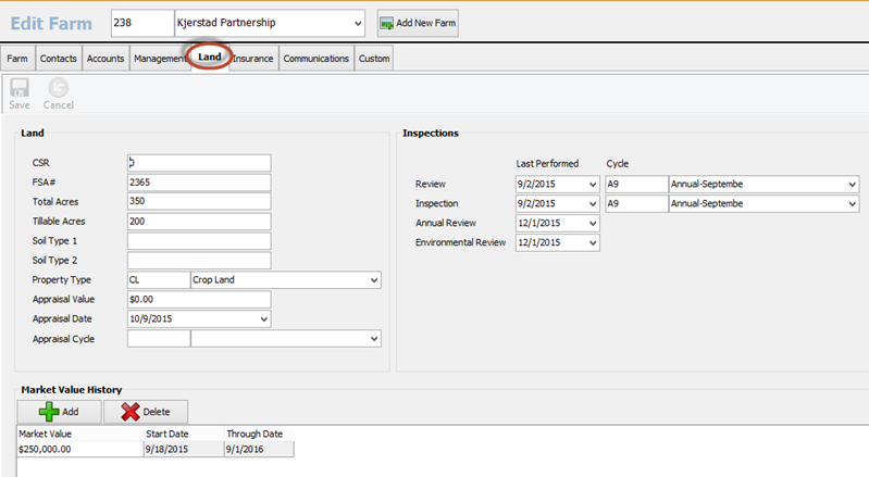 The 5th tab in Edit Farms is the Land Tab. This tab holds all the land, inspection, and market value information for the selected Farm.