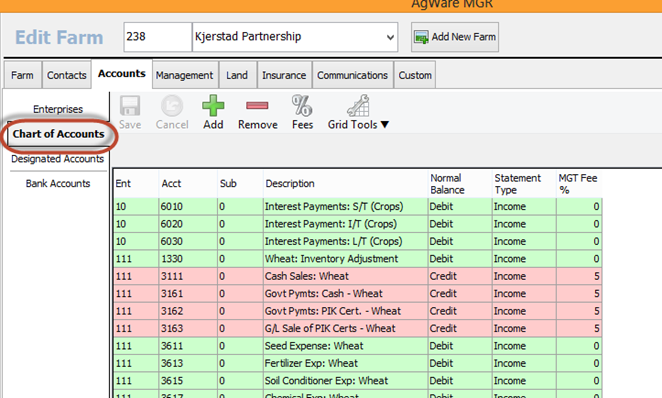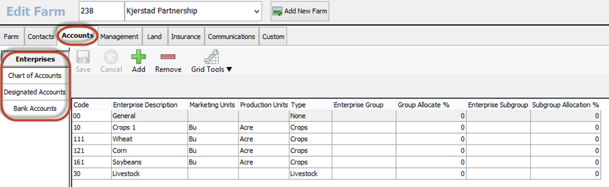 The third tab is the Accounts tab. The accounts tab is comprised of 4 sections: Enterprise, Chart of Accounts, Designated Accounts, and Bank Accounts. These are the specific accounts associated with this farm. You will use the Add and Remove buttons to add items and remove items. These sections will not delete items, only remove the item from the farm as long as a transaction is not attached to it. Below we are showing the Enterprises section. This is where you will add and edit Enterprises associated to this Farm. Please be sure to add your General Enterprise on a new farm so you can see all your general GL accounts in Chart of Accounts.