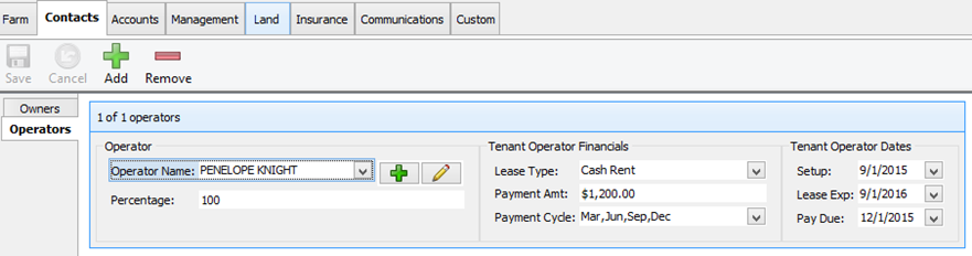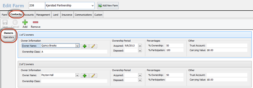 The second tab is the Contacts tab. This is where the owners and operators information is stored. You can click on Owners and the hit the Add button to add an owner.