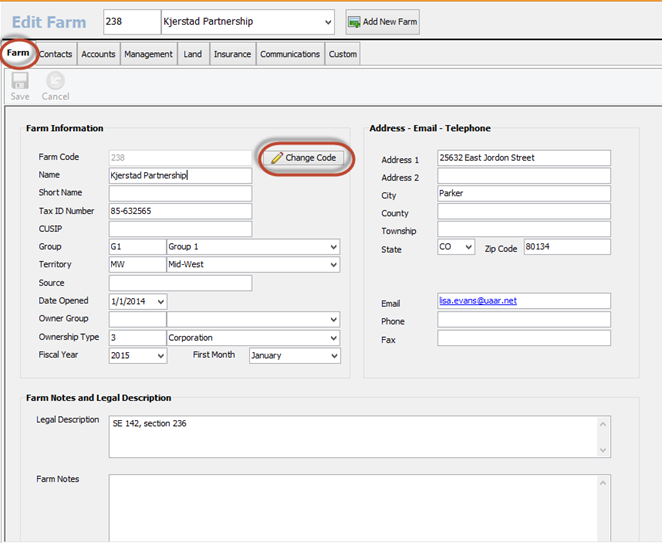 The fist tab is the Farm tab. This tab holds the general information about the farm. It is also where you would go to change the Farm Code if needed.