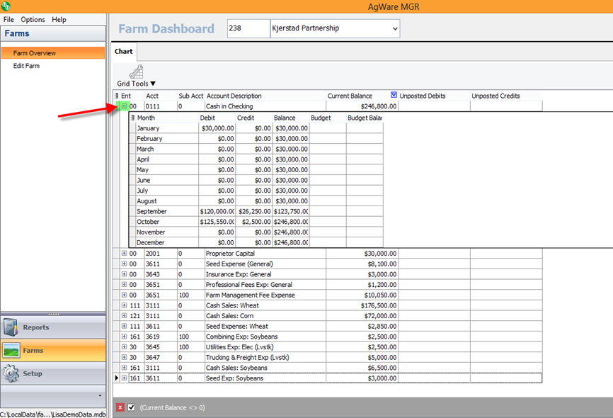 When you choose a Farm the Overview will show you the activity in that Farm’s GL accounts. You can click on the + sign next to the Enterprise Code to get a monthly view.