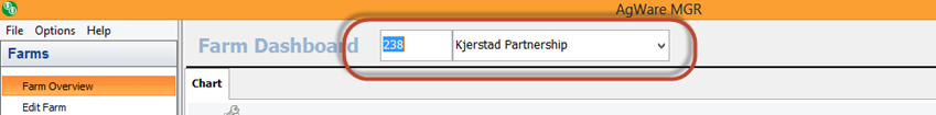 When you open this section there will be two left side options, Farm Overview and Edit Farm. The program will first open to Farm Overview. You will need to choose a Farm. You can do this by typing in a Farm Code, using the Farm Code drop down, typing in a Farm, or using the Farm drop down.