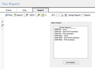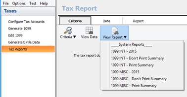 To run a tax report, either click on the report drop down on the criteria tab and choose the desired report, or click on the report tab, highlight the desired report and click run.