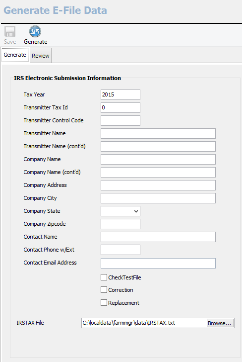 The Generate E-File Data section will assist you in submitting your 1099 information into the IRS FIRE (Filing Information Returns Electronically). If you have previously submitted through the FIRE system, you will simply fill out all information and click generate. If you have not used the FIRE system before, you must submit an application to receive a Transmitter Control Code (TCC). Here is a link to the IRS site: https://www.irs.gov/Tax-Professionals/e-File-Providers-%26-Partners/Filing-Information-Returns-Electronically-(FIRE). Once you have your TCC you can fill in the form and the 1099 information will be sent to the IRS. The review tab will show you a preview of the generated .TXT file.