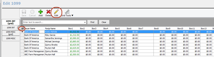 The edit 1099 tax section has four tabs – a grid edit tab for each tax form and a form edit tab screen for each form. The grid edit format allows you to see multiple tax records at a time for quick editing and number checking. To edit directly in the grid, simply click in the desired field to enable the field, make your changes, and click the save button. You can also click on the edit toolbar button to jump directly into the form edit mode for the currently highlighted tax record. If you need to find a specific tax record in the grid, you can use the search bar at the top of the grid to filter the results by your typed text.