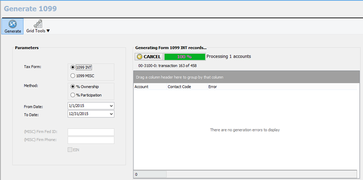 There are only four tax generation parameters for the 1099 INT form: choosing the form, choosing the percentage method, and entering the from and to dates. Once you have these four parameters complete, click on the generate toolbar button. You should see a progress area appear on the right side of the window once you click generate. This is also where any generation errors will appear, we will cover how to fix those shortly. We do not create 1099 INT for owners with 0% ownership, please contact us if you need this feature.