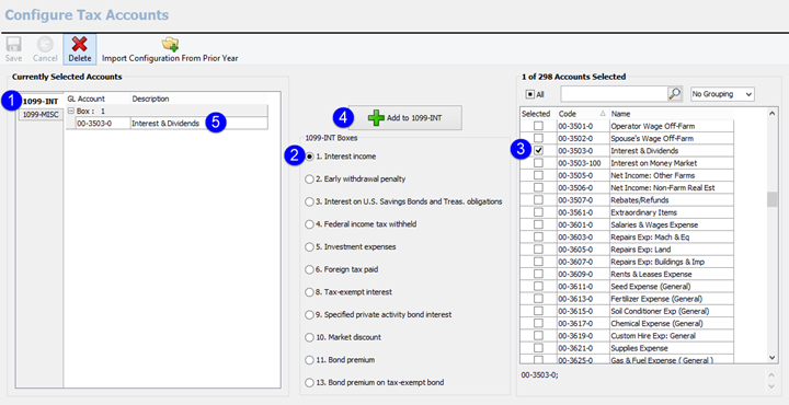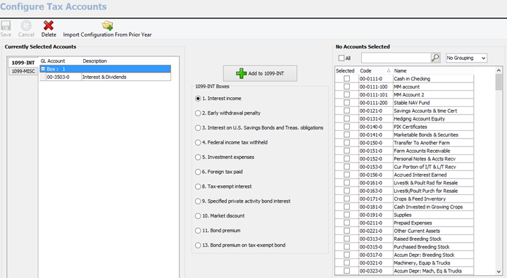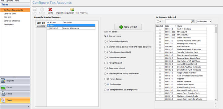 The first section is Configure Tax Accounts. This is where you will add GL accounts to each box on the 1099 INT and 1099 MISC. You can either Import your GL configuration from last year, or you can start new and do it from scratch. I will walk through both options.