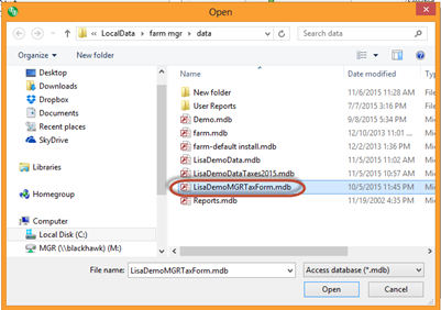 The open box below will open to help you find your last tax database. If you are looking for the last tax database done in AccuTech, it will have MGRTaxForm.mdb at the end of the file. Click on the database you want and then click OK. The GL accounts will populate to your boxes.