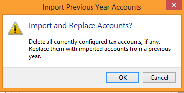 The first option is to Import Configuration from Prior Year. To do this click on the Configure icon. When you click on the icon you will get the box shown below. This is warning you that when you import prior tax information, any new items you may have added will be replaced by the imported tax information, so it is important to import first and then add new GL accounts. To continue, click OK.