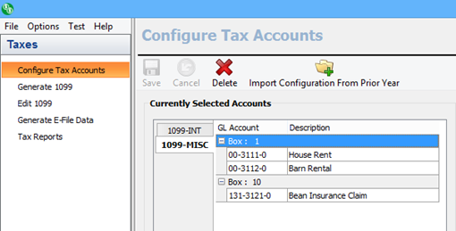 Configuring your tax accounts is the first step in preparing the 1099 INT and MISC records for the year. When you first open the configure tax accounts section, you’ll see three main areas: Currently Selected Accounts (left), the Box selector (middle), and the GL Accounts Selector (right). The currently selected accounts area has two tabs, one for the INT boxes and their GL accounts and one for the MISC boxes and their GL accounts.