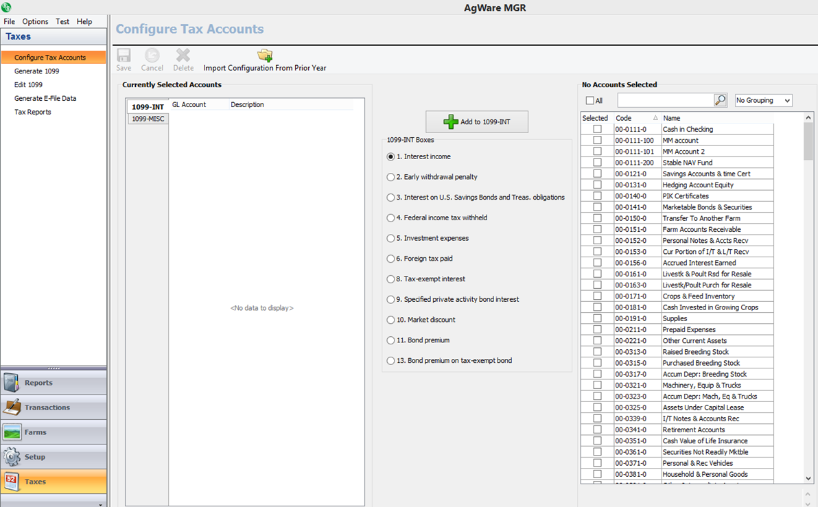 Rather than manually configuring your tax accounts, you can import last year’s configuration by clicking on the ‘import configuration from prior year’ toolbar button. When you click on this button, you will see a pop up warning that tells you all currently configured tax accounts will be deleted and replaced with the imported accounts. When you click OK you will see a Windows open dialog box open to the current database location. This should also be where your tax database resides. If you are importing last year’s AccuFarm tax database it will have “MGRTaxForm” in the file name. All tax databases will have a .mdb file extension. Once you find the desired tax database in the list, click on it, and choose open. After you’ve imported accounts, you can add or delete accounts if needed.