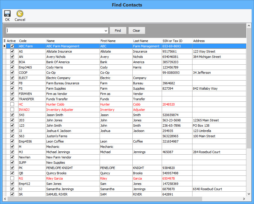 On the top tool bar you can choose the Find Contact button. This will take you to the find contact window which allows you to search for a particular contact by social security number, state, address, or any other means. You can then double click on the contact’s row to open the view/edit window for that contact. A contact in red text indicates that contact is marked as inactive.