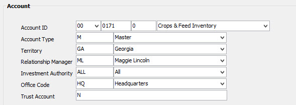 The last section to fill out for a new contact is the account section. This data is for informational purposes only. The Account ID is an old AccuTech field that was left in the contact section for prior users, we feel there is no reason to enter any information in this section. Account Type is used to identify the type of trust, such as “Personal Trust” and “Guardianship”. Territory refers to the farm territory. Relationship manager is the trust officer responsible for the farm owner’s trust, and investment authority type indicates how much investment a management firm is allowed to make on behalf of an owner. The office code identifies the office associated with an owner.
