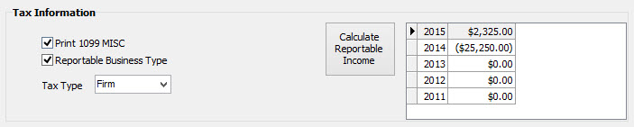 The Calculate Reportable Income button will show the yearly reportable income for the contact.
