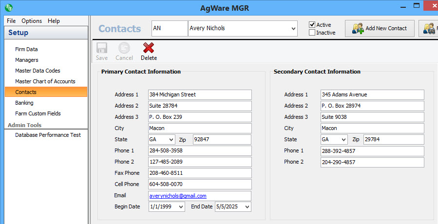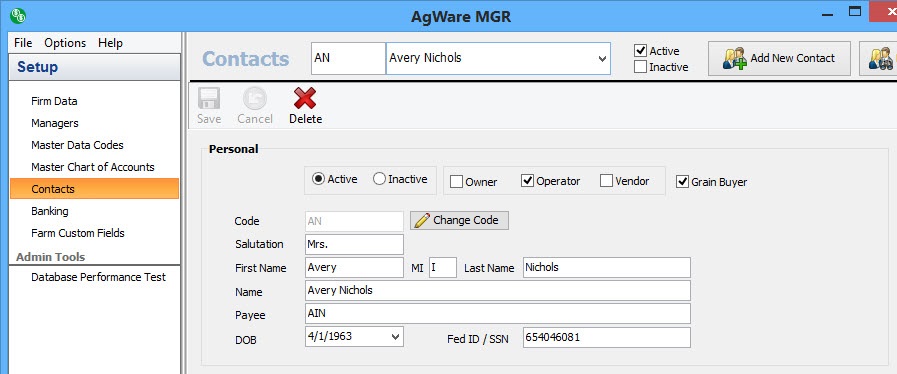 The first item to choose is whether this is an active or inactive contact; chances are they will be active. Next you’ll want to choose whether the contact is an owner, operator, vendor or any combination of the three. You do not need to enter the contact three different times to mark them as an owner, operator, and vendor simply check the appropriate boxes. You’ll also want to specify whether this contact is a grain buyer by either checking or unchecking the grain buyer check box. Next, you’ll need to enter a code for the contact. This is a user defined code, so it can be any combination of alpha or numeric characters, as long as it is unique (don’t worry, the program will double check the uniqueness for you). AgWare does recommend keeping a consistent coding system in place for database integrity. Next you’ll start entering the information about your contact. Simply tab or click through the remaining fields in the personal section. Please note that the Payee Name is the name that will appear on checks for this contact, so it is important to fill in this section. Also, be sure to fill out the Fed ID/SSN field, this field must contain nine characters to be valid for tax reporting.