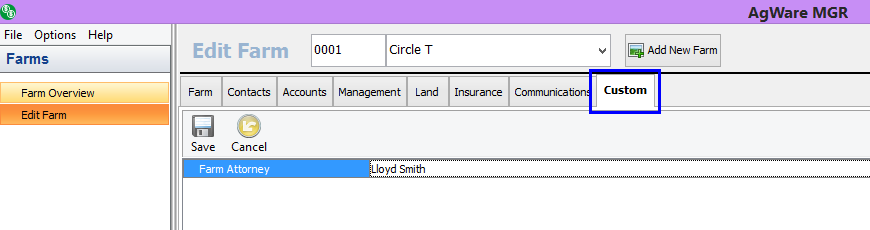 The custom tab of the edit farms section allows you to enter data into custom fields that were created in the setup section of the program. You cannot edit the labels on this screen, but you can enter and edit data in the data fields.