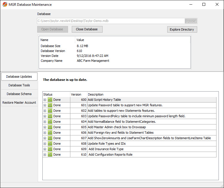 Once the database is up to date, you can close the MGR Database Maintenance tool and relaunch AgWare MGR. You should now be able to successfully login as normal.