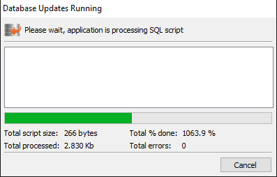 To run the database updates, simply click the Run Database Updates button in the middle of the window. AgWare recommends always leaving the “Backup Database” option checked (it is checked by default) as this will create a backup of the current database. Depending on the size of your database, it may take a couple of minutes to backup the database and apply all database updates; you should see a progress window (shown below) as it is working.