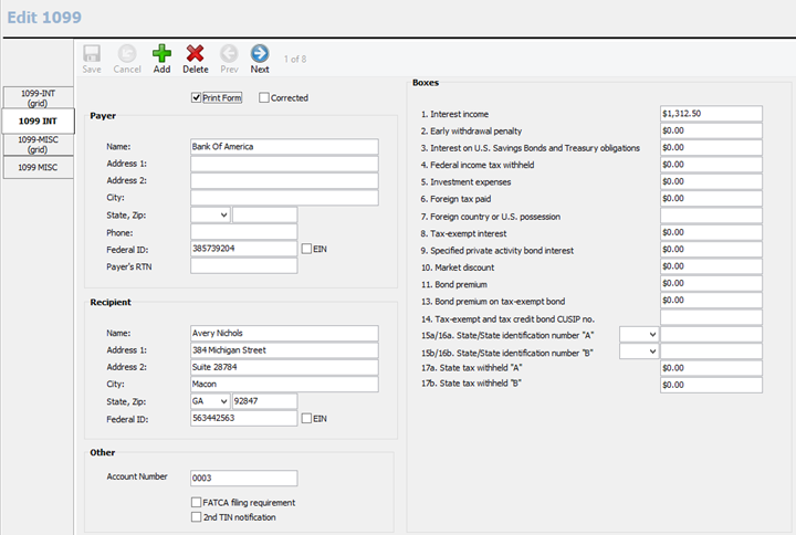 While in the form edit mode, you can click on the next and previous toolbar buttons to move through the tax records. You can also use the keyboard shortcuts Ctrl + left arrow for previous and Ctrl + right arrow for next. Any edits that are made in the INT grid edit tab will appear in the INT form edit tab and vice versa.
