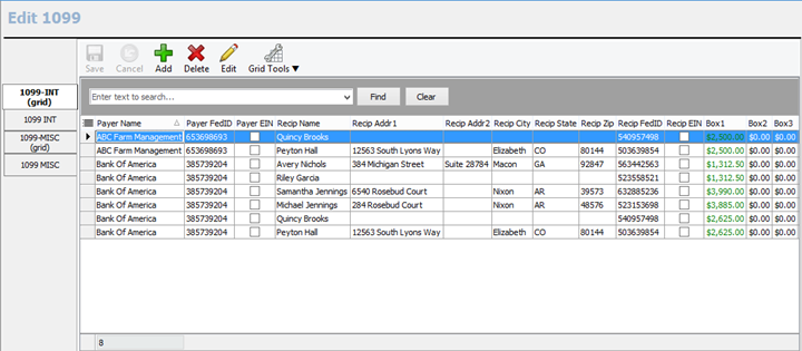 The edit 1099 tax section has four tabs – a grid edit tab for each tax form and a form edit tab screen for each form. The grid edit format allows you to see multiple tax records at a time for quick editing and number checking. To edit directly in the grid, simply click in the desired field to enable the field, make your changes, and click the save button. You can also click on the edit toolbar button to jump directly into the form edit mode for the currently highlighted tax record. If you need to find a specific tax record in the grid, you can use the search bar at the top of the grid to filter the results by your typed text.