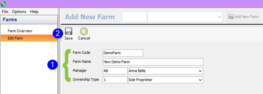 Edit farm is also where you will enter a new farm. To the right of the farm selector at the top of the window, you will see an add new farm button. When you click on this button, you will see the new farm window appear. You will be required to enter the farm code (this is non-editable once saved and must be unique – fifteen character max), farm name (thirty character max), manager, and ownership type. Once you have all four fields entered, click save.