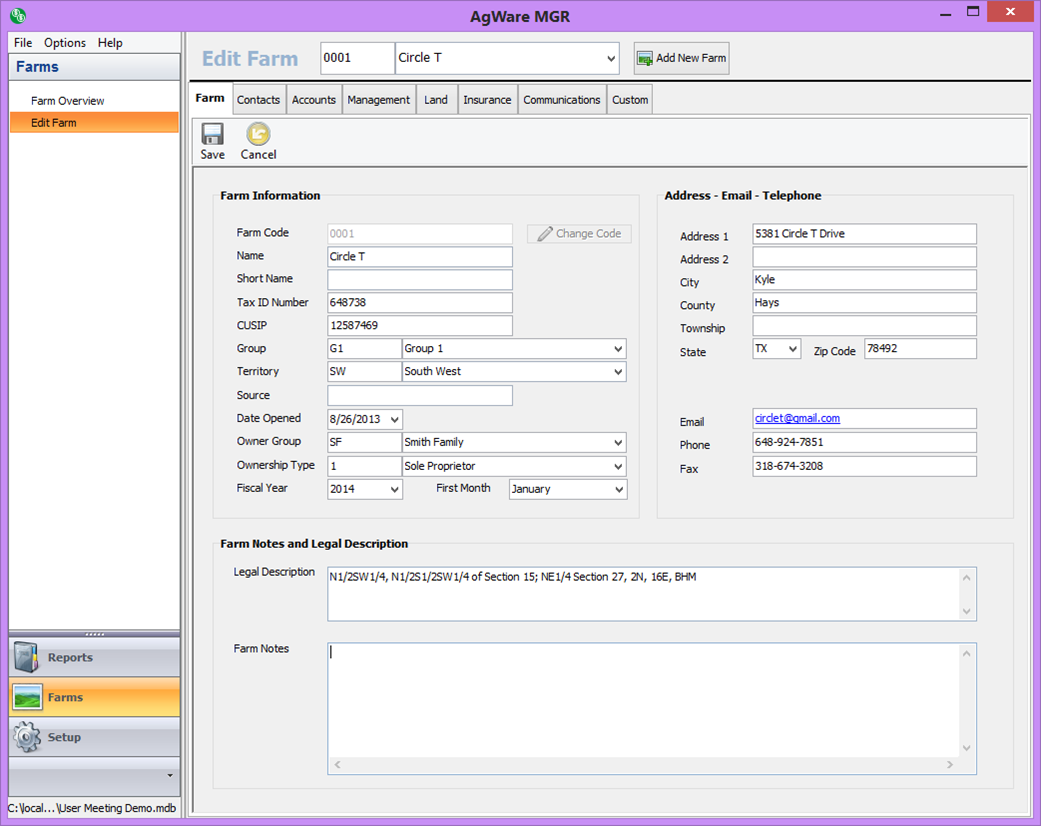 The edit farm section allows you to edit all the information about the selected farm such as ownership, operators, management, GL accounts, communications, etc. When you click on the edit farm section, the default tab is the farm tab and it will open to the last selected farm. You can change the selected farm by choosing the desired farm from the drop down on the top of the screen. The selected farm will remain chosen for all tabs of the edit farm section.