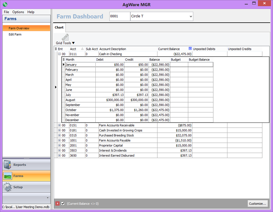 In the main grid view the current balance, unposted debits, and unposted credits are shown for each account that has a non-zero current balance. You will also see a plus sign to the left of the enterprise on each row; when you click the plus button you will see the monthly and overall budget information for the farm.