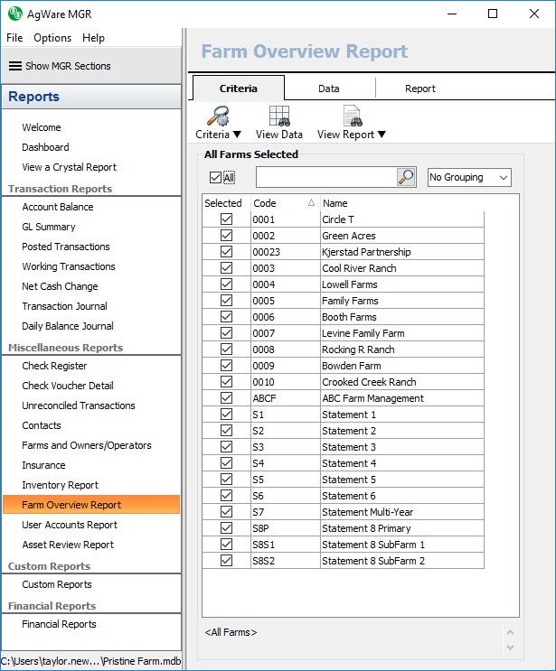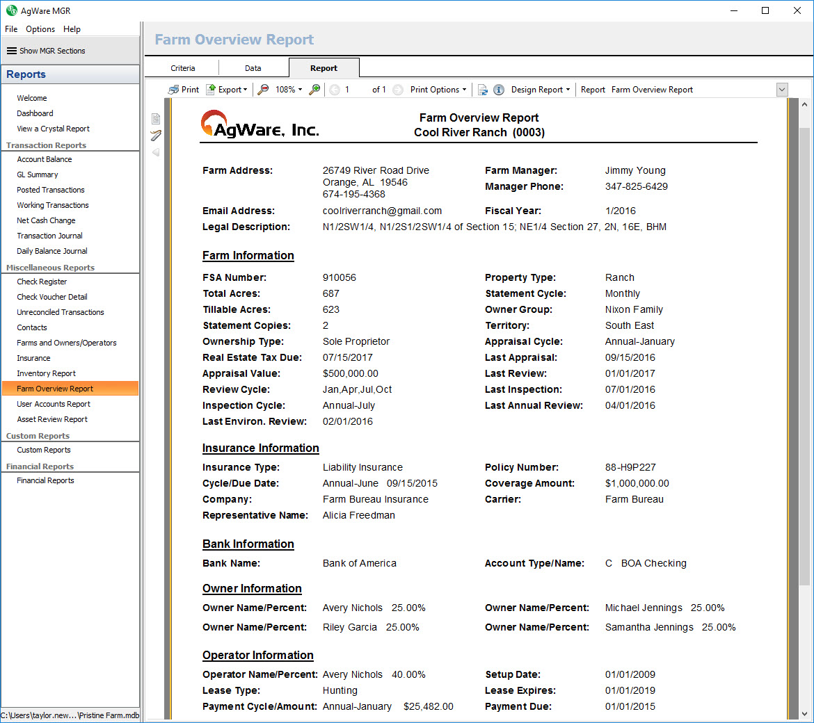 The farm overview report shows information about the selected farm including: farm address, farm manager, important dates, insurance information, bank information, owner information, and operator information.