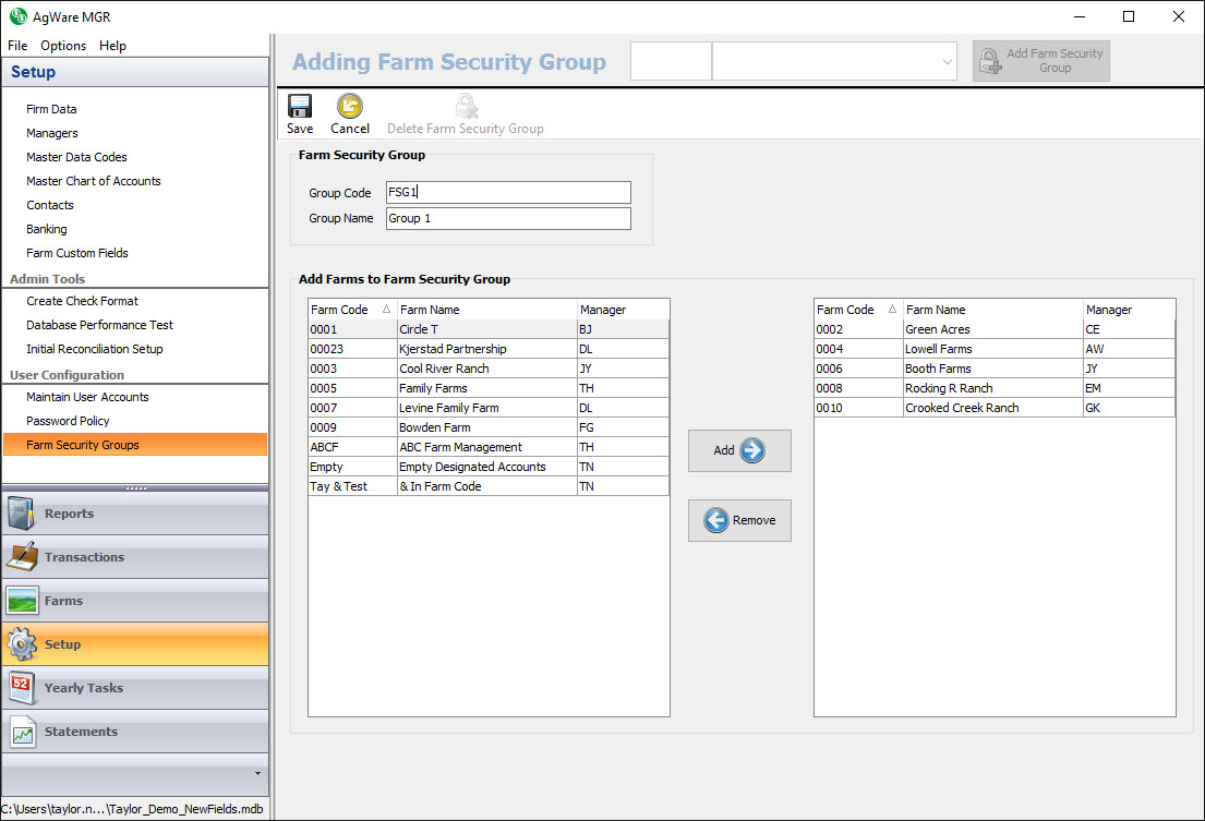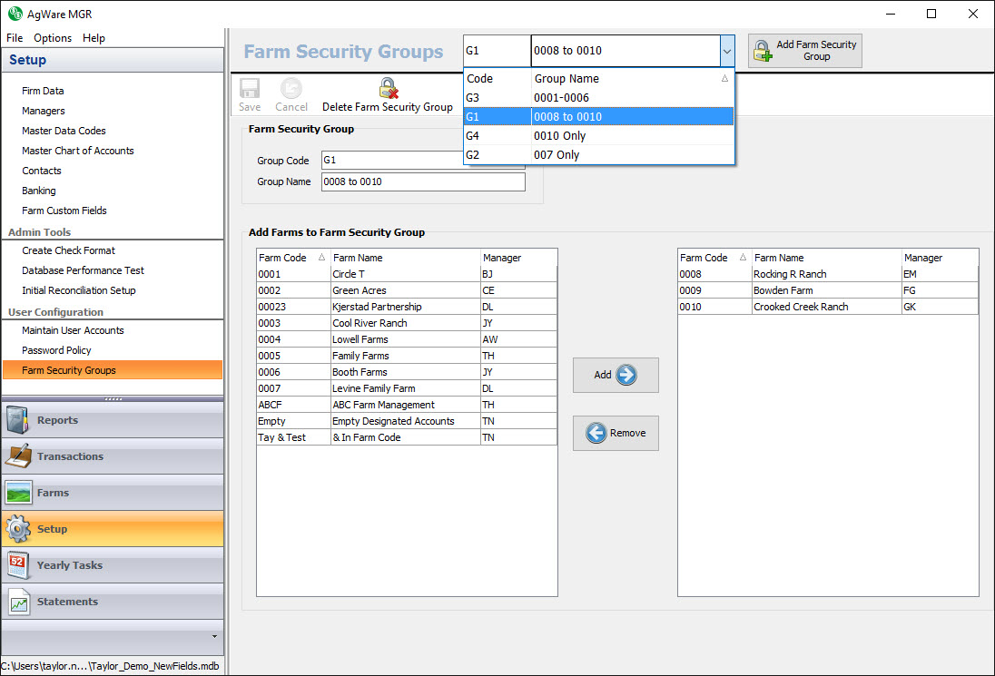 Farm Security Groups are an additional method of controlling a user’s access to data in AgWare MGR by defining the farms a user has access to.