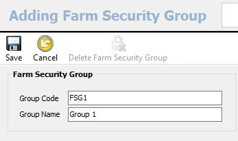 To create a new Farm Security Group, click on the “Add New” button at the top of the screen. This will enable the group code and group name fields for data entry. The group code is a user defined unique code; the group name should also be unique.