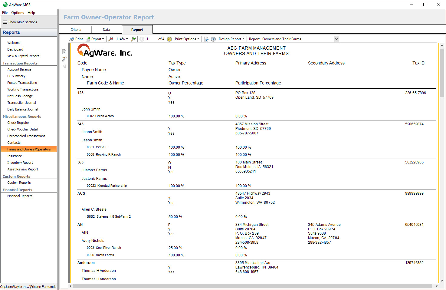 The owners and their farms report shows a list of the selected farms and their owners grouped by owners and sorted by farm code. It also shows additional ownership information such as the ownership percentage, participation percentage, tax types, tax id for the owner, status, etc.