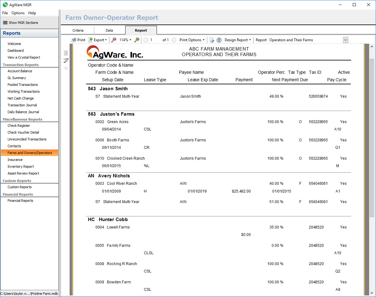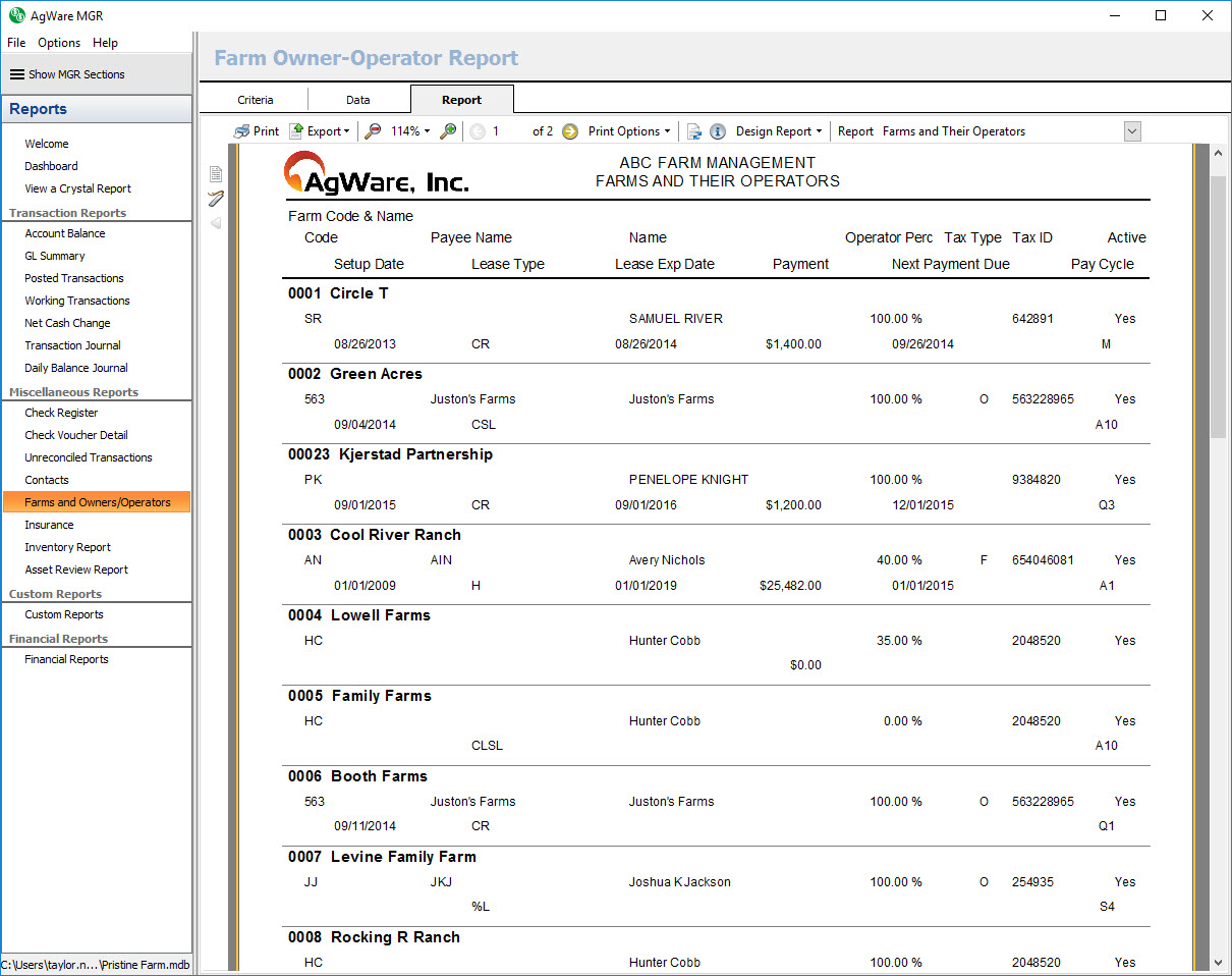 The operators and their farms report shows a list of the selected farms and their operators grouped by operators and sorted by farm code. It also shows additional information such as the lease type, lease date, payment, pay cycle, etc.